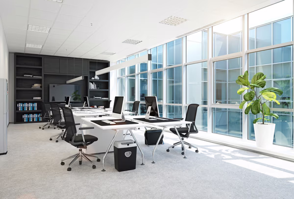 Spacious modern office with white desks, ergonomic chairs, and large windows